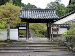 総門から正面に三本杉を観ながら進んで右折、参道の苔は雨に濡れて緑濃くやがて右手の庫裡、方丈への中門をくぐる。
