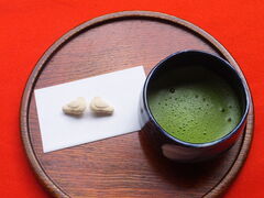 靴を脱いで本堂に入ってお参りし延命地蔵尊も拝させて頂いてから毛氈が敷かれた縁側でお抹茶と鳩の形の干菓子を頂きました。