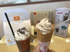 コーヒー豆を購入すると、ドリンク割引券がもらえるので、ドリンクと、ソフトクリーム、ついでにケーキが美味しそうだったので購入しました。