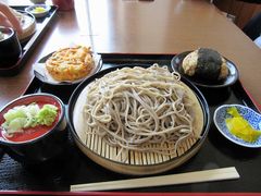 かき揚げ丼とミニ山菜セットはボリューム有り、かき揚げの甘だれれが美味しかった。平日で、空いていたので、ゆっくりでき、コーヒーも美味しくいただきました。窓際のテーブルが景色も良くお勧め。