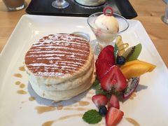 ふわふわのパンケーキ。見た目は可愛らしく、フルーツもたくさん盛りつけられています。ネーミングも天使のパンケーキなどがあっておもしろいです。