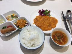 アミュプラザ10Fくうてんにありランチタイムだったのでお客さんも多かったです。ランチメニューから選んでチャイナをいただきました。メインに小鉢、ごはん、スープとデザートがセットになっていてメインとデザートは選ぶことができます。メインはエビチリでデザートは杏仁豆腐にしました。アートアクアリウム展を観に行った後だったので半券で金魚の点心のサービスもありました。