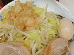 トッピングに豚肉、アブラ、煮玉子を選んで、ガッツリと食べました。