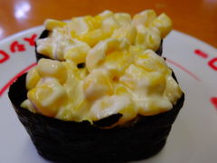 エビとアボガドのお寿司でロール寿司は一皿100円でボリュームがあって、結構食べてしまいました。店員さんも優しいです。