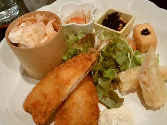 気に入って再訪問。ランチは種類がいくつかあり、目新しいのを選びました。湯葉巻き天ぷらとあじフライ。ランチにたいてい付いてる豆腐が旨いです。あじフライもなかなかです。みそ汁も美味。あとは、ごはんがやや残念。いつも売り切れる出来たて豆腐ランチが食べてみたい!