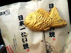 日本一の看板に誘われてお店に行きましたが行列ができておりあんこたっぷりのタイ焼きでした。おいしかった〜。