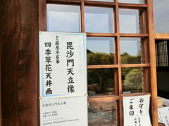 本堂は改修中でしたが、寺宝の毘沙門像と竹内栖鳳や一門の絵画をゆっくり鑑賞出来ました。奥庭は座って眺められますが、一番の見所である枯山水「虎嘯の庭」はガラス越しなので少し不満が残りました。