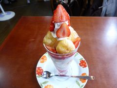 ランチの後に立ち寄りました。果物屋の中にイートインがありそこでいただきます。1ランク下の苺だらけパフェと桃だらけパフェを注文。メニューのイラストよりは果物が少ないように感じますが、ボリュームは十分。見た目は苺の方がおいしそうですが、食べてみると桃の方が甘みがありおいしかったです。ちょっとおいしい果物を食べるにはいい店です。
