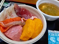 10枚1300円でチケットを買い、食べたい食材をチョイスしご飯の上に乗せてオリジナル丼を作ります。名付けてのっけ丼と呼ぶのだそうです。海産物だけではなく、惣菜等もあります。それほど大きくない店内ですが、出来上がるまでに5周りくらいしてしまい結構体力消耗しました。