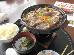 「青の洞門」から。「九重夢大吊り橋」へ向かう途中、食事をとるため寄りました(本日の宿は素泊まりなので、早めの夕食です)。豊後牛焼肉定食1500円、久留島流すき焼き1600円(当時の価格)を美味しくいただきました。道の駅ですので、駐車場は広く農産物販売所やトイレなど完備されておりました。敷地内には桃太郎とお供の大きな像もありました。また辺りを見回してみると、桃太郎から向かって反対側の、やや遠い小高い岡の斜面に、大きなな鬼の像を見つけました。なるほど、見落とすところでした。桃太郎と鬼が向かい合っている・・・そういう壮大なシチュエーションだったのですね。