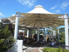 養老公園内の大きな白いテントの下が楽市楽座、屋台風の飲食店が多く集まっています。皆さん各店で好きなものを頼み、テントの下で日差しを避けながら飲食していました。
