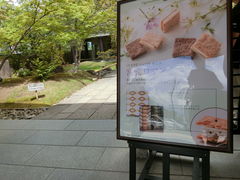 小倉山荘ファームダイニングカフェを諦めるが、ほかに食べるところあるか不安になる。。ということで、どらやきを買いに「明月菓寮」へ行き、「小倉山荘リ・オ・ショコラ」で洋菓子いただき。