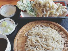 湯畑のすぐそばなので、帰りのバスに乗る前に必ずこちらで昼食をとります。舞茸天ぷらのお蕎麦をいただきます。
