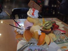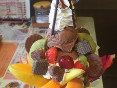 天井から注がれるカフェオレは必見です! またパフェもなかなかでかさです。こちらもオススメです。しかもリーズナブル! フルーツパーラーでもあるので、いろんなフルーツがたくさん乗っています。
