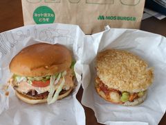 こちらの海鮮かき揚げのライスバーガー目当てで訪れました。さっぱり味ですが、エビと野菜のかき揚げとほんのり焦げたご飯のバーガーが良く合います。合わせてたっぷりのレタスやトマトとピーマン等が入った「モス野菜バーガー」もいただきました。こちらは他のバーガーと比べてカロリーが少なくてヘルシー志向の人にはいいです。
