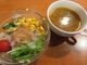 サラダと牛すじベースのコンソメスープ、メインプレート、ごはん、ピクルス+地元タウン紙のクーポンのデザート