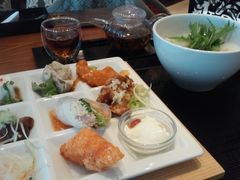 ランチ時に早めに行きました。お店は広いですが、あっという間にお客さんで埋まっていました。ランチメニューはお粥メイン、中華メインとあり、おなかが空いている人もそうでない人も一緒に食べられます。初めてだったのでプレーンお粥とおかずのセットにしました。ちょこっと中国茶もついてきて、急須が小さいので2回くらいお湯をお替りしました。お粥とおかずはとてもおいしかったです。