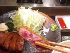 牛なので、中が半生のステーキ状態の牛カツがとろける美味しさでした。絶妙な揚げ具合で、アツアツさっくりでした。