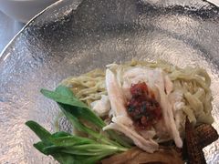 透明な器に盛られ、涼しげな姿で登場です。大きな器のセンターにちょこんと盛られた麺。メンマ,ルッコラ,鶏胸の蒸し千切り,焼きベビーコーンが添えられ、彩り豊かなオシャレな出で立ち。