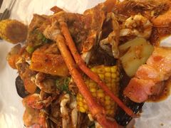 テーブルに海鮮など並べて豪快にいただくスタイルです。とてもボリューミーです。店内も楽しい雰囲気でした。