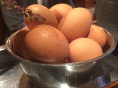 テーブルには生たまごが盛られており、いくらでもいただいて良いという。