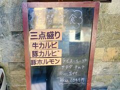 会社の仲間達と仕事始めの昼休みに初訪問!昼時もあってとても混んでいましたが、直ぐに案内して貰いました。今回は日替定食「三点盛り(1,045円)」を注文!牛&豚カルビに豚ホルモンと柔らかくて美味しいお肉三点盛りにサラダやスープ、キムチに烏龍茶が付いて、味もコスパも最高でした(o^^o) 店員さんも活気があって凄く良いお店でした!是非また訪れたいと思います(^o^)