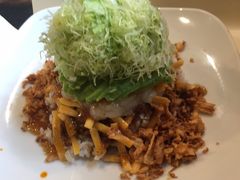 レタスの千切りがたっぷりのっている下には アボカドのスライスした物 まわりにはオニオンフライチップが