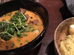 念願のイエロー。いつも行列でやっと頂くことができました。友人からはクセが強いから最初はチキンカリーみたいなのが良いよ言われていたが、気になったので「じっくり煮込んだラム肉とBlueHerbのカリー」をチョイス。辛さは初めてなので3.5にしましたが4.0でも良かったかも。思っていたようなクセは感じず美味しく頂きました。また食べたい。