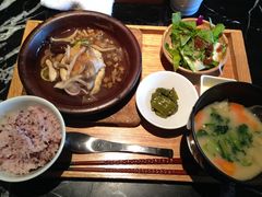 「野菜を食べて体の中から元気になれるレストラン」をモットーにしているだけあって、契約農家直送の旬の野菜をふんだんに使ったお料理がいただけます。系列店のディナーで食べた「農園バーニャカウダ」と「お野菜しゃぶしゃぶ」がとても美味しかったので、今回ランチで利用してみました。ランチメニューは7種類。カレーやハンバーグ、豚のせいろ蒸しなど野菜だけではないのでお肉が食べたい人でもOKです。今回は「アスパラたっぷり肉団子のあんかけ定食」と「初夏のお野菜と鯛のちらし寿司 季節の天ぷら付き」を食べましたが、ごはんがヘルシーな紫黒米入りご飯。私にはやや薄味に感じられましたがボリュームはたっぷりでした。平日でも12時過ぎには満席になる人気ぶりだったので、予約するか少し時間をずらした方が良さそうです。
