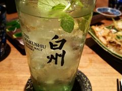 このお店は本来は比内鶏と秋田料理と串がメインらしいのですか、二軒目なので、飲みが中心です。なんと!2013年3月に終売となった白州10年がおいてあります。現在のオークションサイトでの平均落札価格は3万円前後、そして白州12年の休売宣言もあり、白州は当分飲めないものと思っていましたが、ハイボールで650円!!白州ファンの自分としては知らずに入った分、大感激です。さっそくオーダー。ミントの葉は元気がなかったですが、まさに白州!結構感動しました。友人は万作の花。おちょこは選べます。また、チェイサーをお願いすると切子グラスで出してくれました。切子ファンでもある自分にとってはとっても居心地の良いお店です。