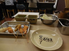 大人気店のようで、金曜の晩21時頃でしたが、5人ほど待っていました。大阪城コースとお肉の3種盛りをたべました。衣がふわふわの触感で美味しかったですね。お決まりの2度漬け禁止もしっかりと表示されていました。
