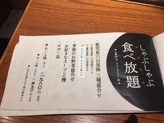 横浜ルミネ7階にある黒ぶたやに行きました。人気があり、いつも混んでいます。食べ放題しゃぶしゃぶを注文しました。90分、ラストオーダー60分。2種類のスープが一度に味わえます。野菜の盛合せ、三種類の豚肉、シメの雑炊やうどんも食べ放題。満足しました!