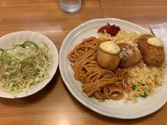 トルコライスのミックスです。こちらのトルコライスは,カツではなく,コロッケです。ミックスというのは,コロッケの種類が3種類ということのようですね。