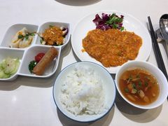 ランチメニューから選んでチャイナをいただきました。メイン、小鉢、ごはん、スープ、デザートのセットでメインとデザートは選ぶことができます。メインはエビチリ、デザートは杏仁豆腐にしました。アートアクアリウムの半券で金魚の点心のサービスもありました。