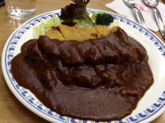 カレーはしっかりデミグラが効いた味で、それほど辛くはなく、昔ながらのカレーという感じです。