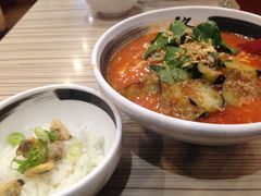 トマト?て感じで食べたらめちゃくちゃ美味しくてハマります。ラーメンなんですがドロリとしたトマトスープが麺によく絡み、締めにアサリの炊き込みご飯とスープを混ぜ混ぜして食べます。タバスコをお好みでかけるんですが酸味がプラスされて濃厚スープとよく合います!