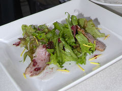 いつもあるメニューなのかわかりませんが、マグロをソテーしたものがかなり美味。おしゃれなお店、テラスを出たら潮風に当たれます。サンセット時が最高!
