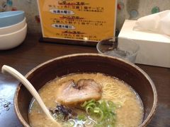 鶴間駅イトーヨーカドー1階にあります。日曜午後1時半で、テーブル席は満席、カウンター2席のみ空いていました。明るい接客で女性の私に荷物置きのカゴも用意してもらえて感じの良い店でした。醤油豚骨(750円)を注文しましたが、ラーメンが運ばれてきたときのにおいが独特でくさく感じてしまいました。味は濃すぎず普通に美味しい感じでした。