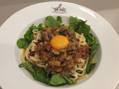 おすすめパスタの「飛騨牛すじの甘辛煮込みのトロ玉ボロネーゼ」とカプチーノを頂きました。