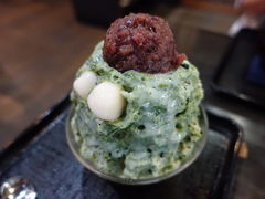 桃の果肉をつかったカキ氷が有名で、夏場は開店前から列ができる。ランチでは「湯葉あんかけうどん@800円」はトロトロの湯葉の食感がよい。「湯豆腐@650円」は寒さ厳しい京都の冬も湯豆腐を食べてほっこり温まる。