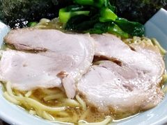 塩分強めの醤油豚骨スープです。家系らしく濃いめが選べますが普通でもかなりの強さです。薄切り大判チャーシューと、ほうれん草、のりのトッピング。