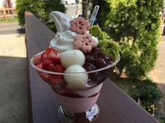 ぶどう畑のれすとらんのバイキングも人気ですが売店のジェラートやパンも人気です。ドライブに出かけた時はジェラートをよく食べますが定番のものからアスパラや梨やぶどうなど季節によって出るのが楽しみです。農産物直売所もあったり菓子工房のプリンも美味しいです。今回は創業祭限定の春パフェとフレッシュな苺の角切りがたくさん入ったジェラートを食べましたが美味しかったです。