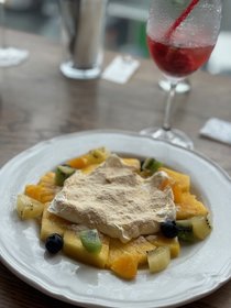 たっぷりフルーツの上にヨーグルトムースがのっているデザートなのですが、店員さんが目の前で