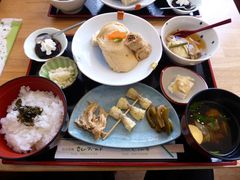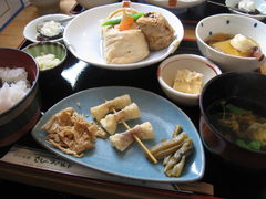 ゆば御膳(1800円)を注文した。色々なゆば料理を味わえる。ゆばを串にさして揚げた串ゆばはカリっと揚がりスナック感覚で楽しい。メインの福ゆばは、さながらゆばの太巻きといった趣。薄めの味付けがされている。ボリュームがあるが、ゆばの上品な味を堪能できた。酢の物などもあり味の変化もあって美味しかった。席数は少ないので、時間帯によっては待つ覚悟が必要。