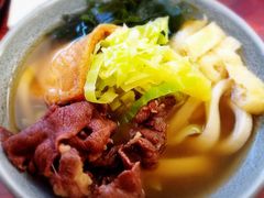 7月末の日曜日の昼に訪れたところ、間が悪く15分ほど待ち。中は昭和感のある雰囲気。せっかくなのでということでムサシうどん、ただかき揚げが品切れで馬肉かガゴメコンブになりますとのことで馬肉を。他にキャベツとワカメ、そして刻み揚げとキツネが両方入っているのが不思議な感じですが、満足感は高めですね。そして肝心のうどん、太さは不均一で極太、硬く短め。少しずつ噛んで食べる感じは、うどんというよりすいとんという感じ?美味しくいただきました。
