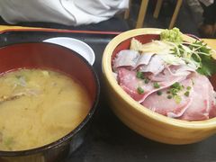 注文したのは、青魚ランチセット1080円を選びました。丼には、いわし、アジ、シメサバ、シラウオの刺身がてんこ盛りに