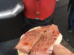 隣が吉本祇園で開場待ちしているときに、テイクアウトの窓口からいい匂いが。。近江牛のにぎりずしです!待ってる間にパクっと食べるのに、最適で思わず購入。ランクは色々あって一番下の2貫600円にしました。てりやきっぽいたれが柔らかいお肉にとってもあっていて、美味しかったです。おせんべいに乗ってるのもGOOD.ごみが出なくて最後までおいしく食べられました。