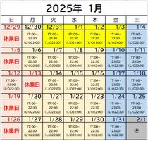 2025年1月の居酒屋営業カレンダー