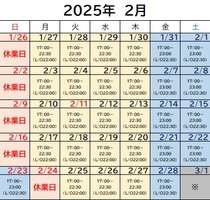 2月の営業時間はこちらの通りでございます。