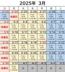 3月の営業時間はこちらの通りでございます。